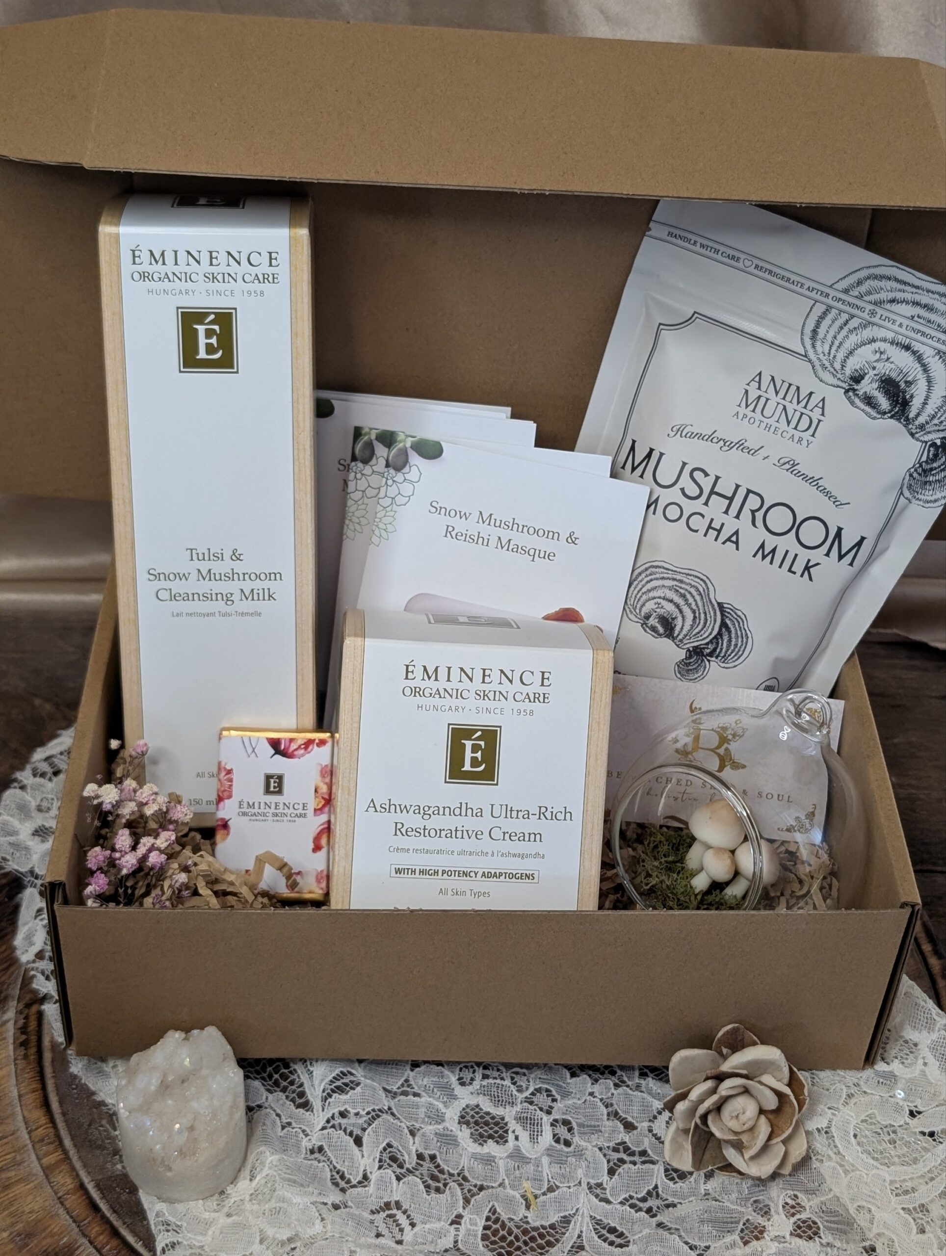 This box is for mushroom lovers – the wise ones who adore the adaptogenic powers of fungi like reishi and chaga and snow mushroom! Inside you’ll find all things shroomy – pick which style box best fits you and your budget. Each product bundle is curated with an exclusive offering and each box comes with a complimentary chocolate bar.